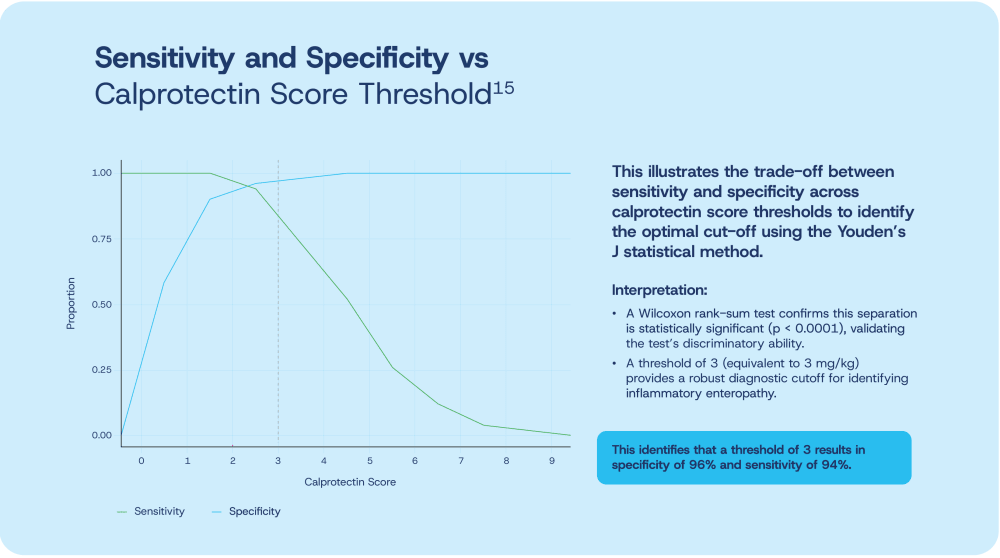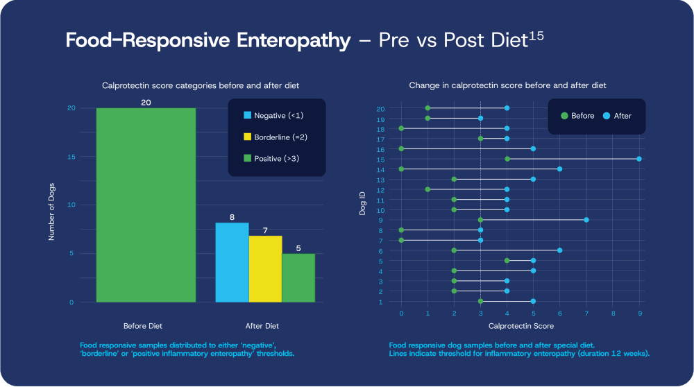 Data from Bristol University support this application. In the validation study, 22 dogs with food-responsive enteropathy were evaluated before and after a three month dietary intervention. All dogs had calprotectin levels in the inflammatory range (≥3 mg/kg) prior to treatment, with a mean score of 4.7. Following dietary management, all dogs had reduced levels of calprotectin and 75% had calprotectin levels that returned to the normal or borderline range (mean post-treatment score: 1.7).