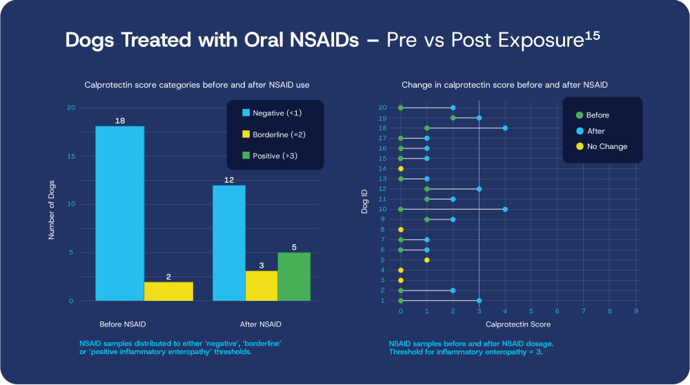 - In a subset of dogs equal to 25%, this rise is consistent with inflammatory enteropathy (a calprotectin score of 3 or above) warranting further monitoring and management of treatment with NSAIDs.